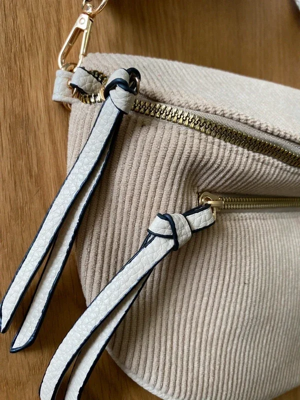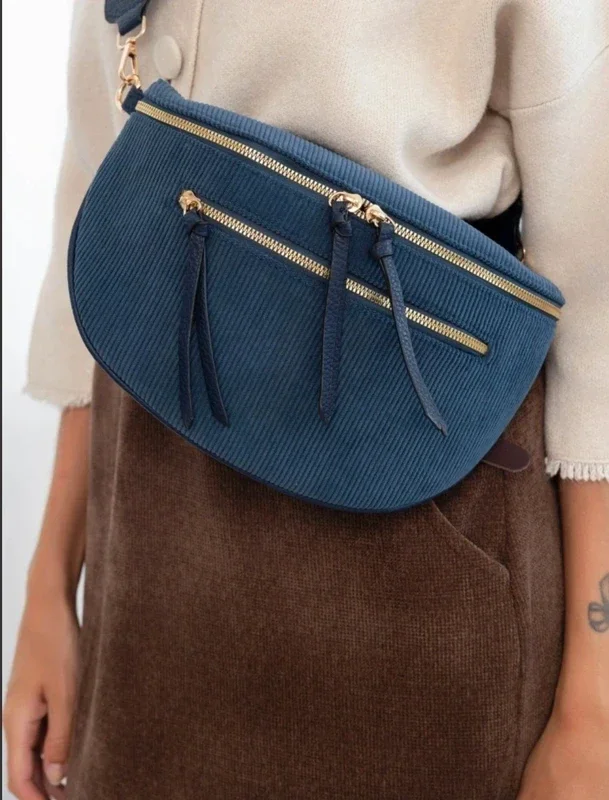 Sac banane velours côtelé à double zip et bandoulière tissée 5cm de large, amovible et ajustable. Poche intérieure. Poche au dos fermée. 18cm x 28cm x 9cm. 3 coloris beige, écru ou bleu marine.