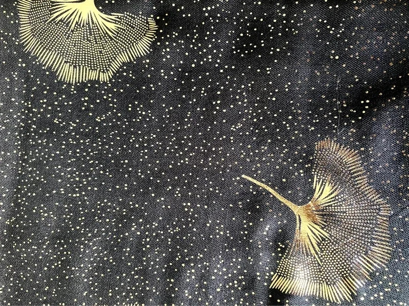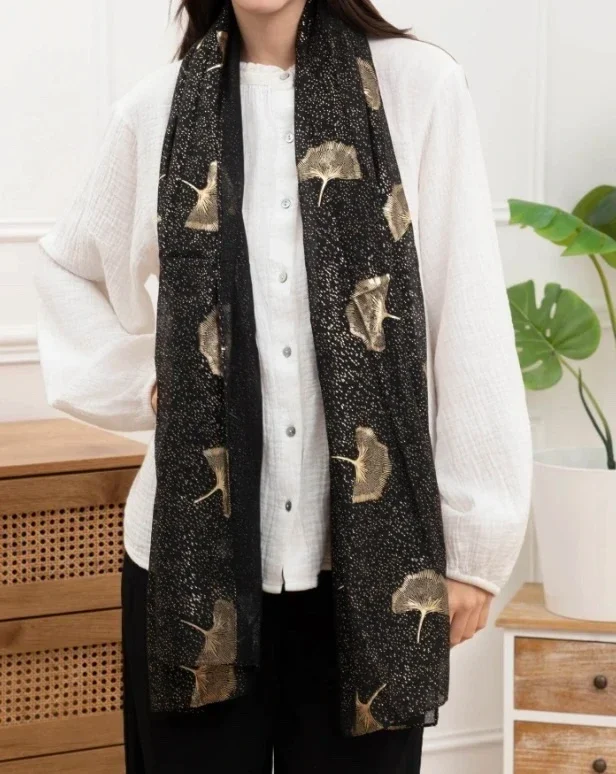 Foulard imprimé noir motif feuilles ginkgo doréés 180x70CM. Composition : Viscose (70%), Coton (30%).