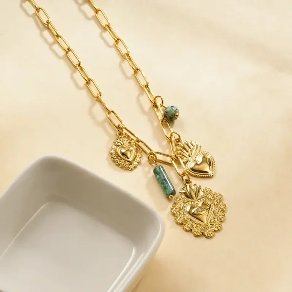 Collier breloques cœurs et pierres vertes.