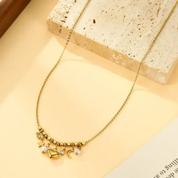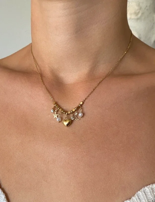 Collier petites pampilles étoile cœur lune strass et perles nacrées. 39cm + 5cm de chaînette de réglage.