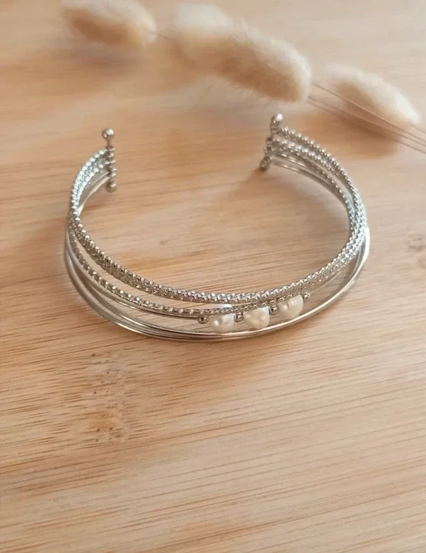 Bracelet manchette acier inoxydable argenté et perle eau douce