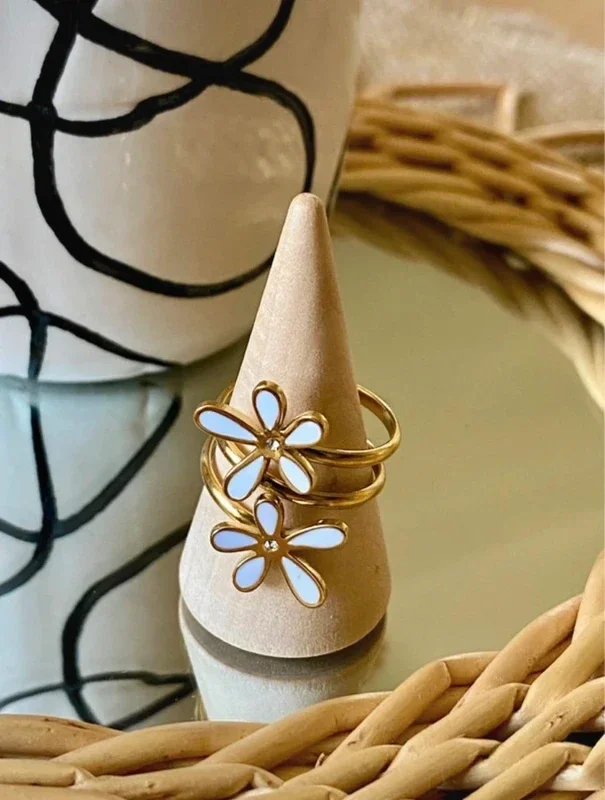 Bague acier inoxydable doré fleurs email vert sauge ou blanc avec petits strass.Taille 56. Légèrement réglable.