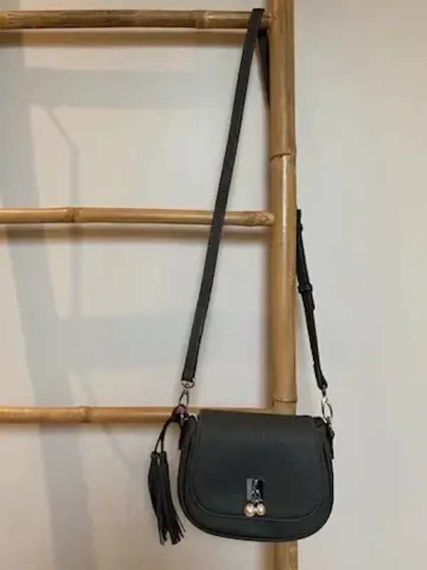 Sac bandoulière gris anthracite et perles, pompons. Un rangement à l’intérieur. Se ferme avec une pression.