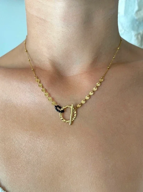 Anneaux de perles noires sur chaîne mini disques. 41cm + 5cm de chaînette de réglage.