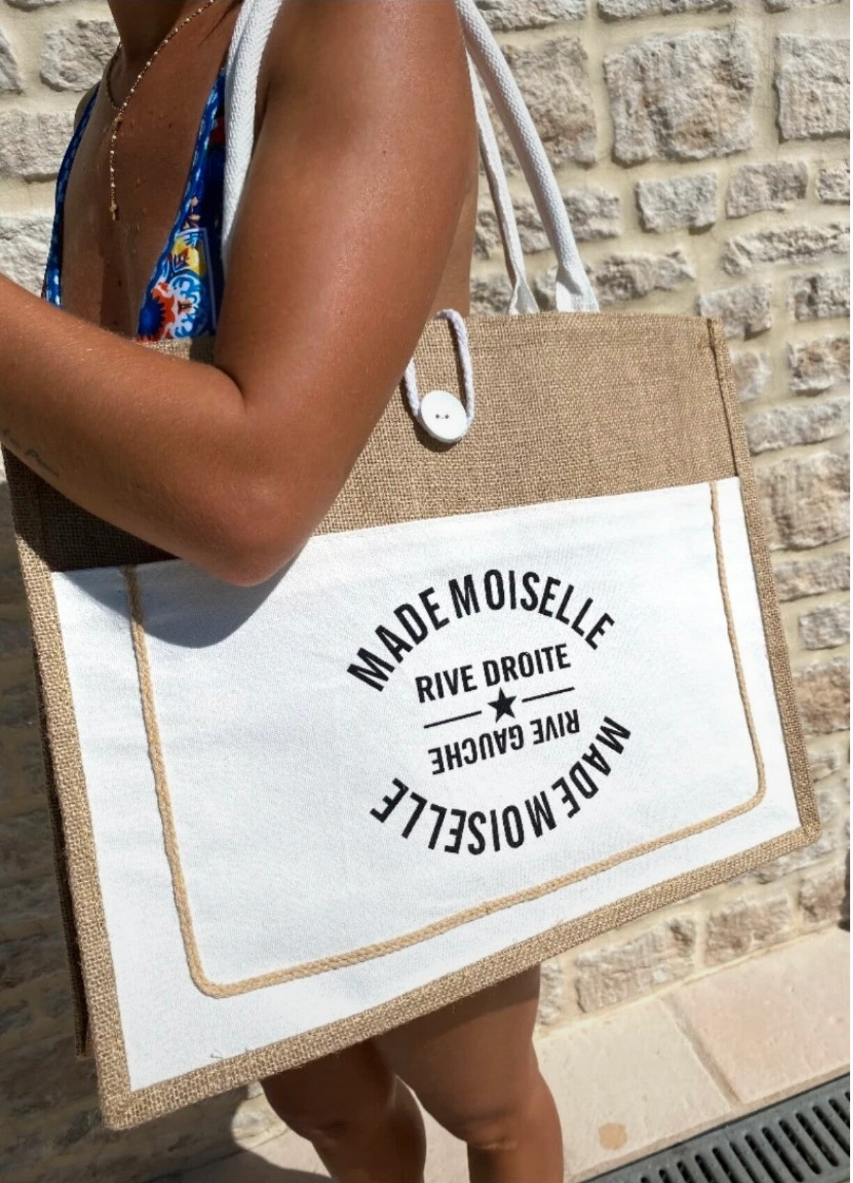 Sac cabas toile de jute "Mademoiselle rive droite, rive gauche" se ferme avec un cordon et un bouton, 45,5x35cm.Blanc.16€90