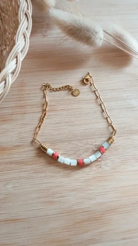 Bracelet perles pierre corail et blanc. 17cm + 3cm de chaînette de réglage.