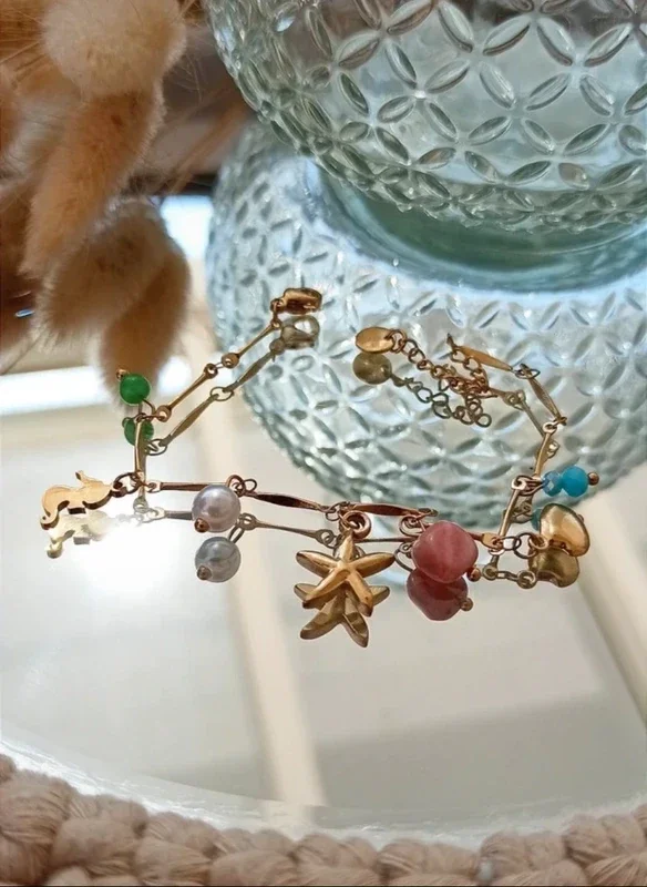 Etoile de mer, hippocampe, coquillage, pierres naturelles rose bleue et verte, perle nacrée. 16cm + 3cm de chaînette de réglage.
