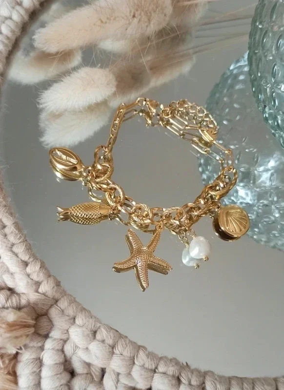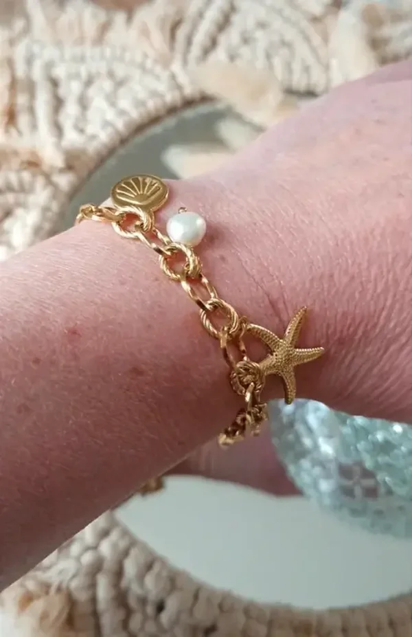 Chaîne 16cm + 3cm de chaînette de réglage. Breloques coquillages, poisson, étoile de mer, perle de culture de synthèse.