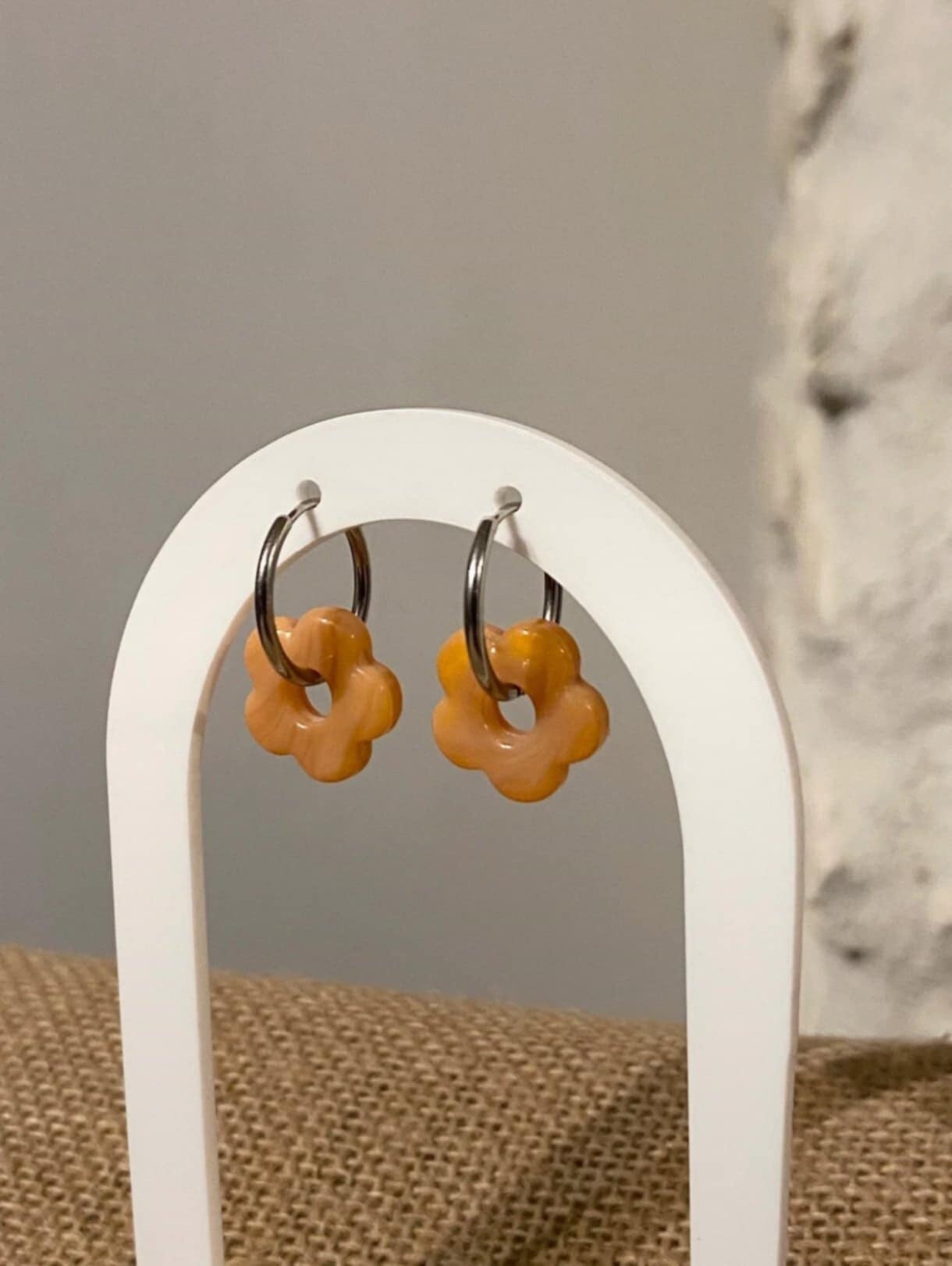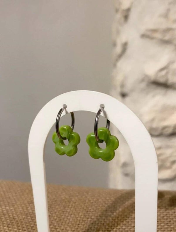 Fleurs en verre 1,5cm de diamètre. Noir, lilas, vert clair, abricot.
