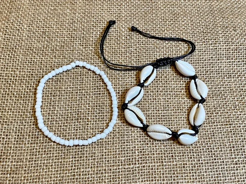 Bracelet de cheville coquillages cordon noir réglable et bracelet de cheville élastique perles blanches.